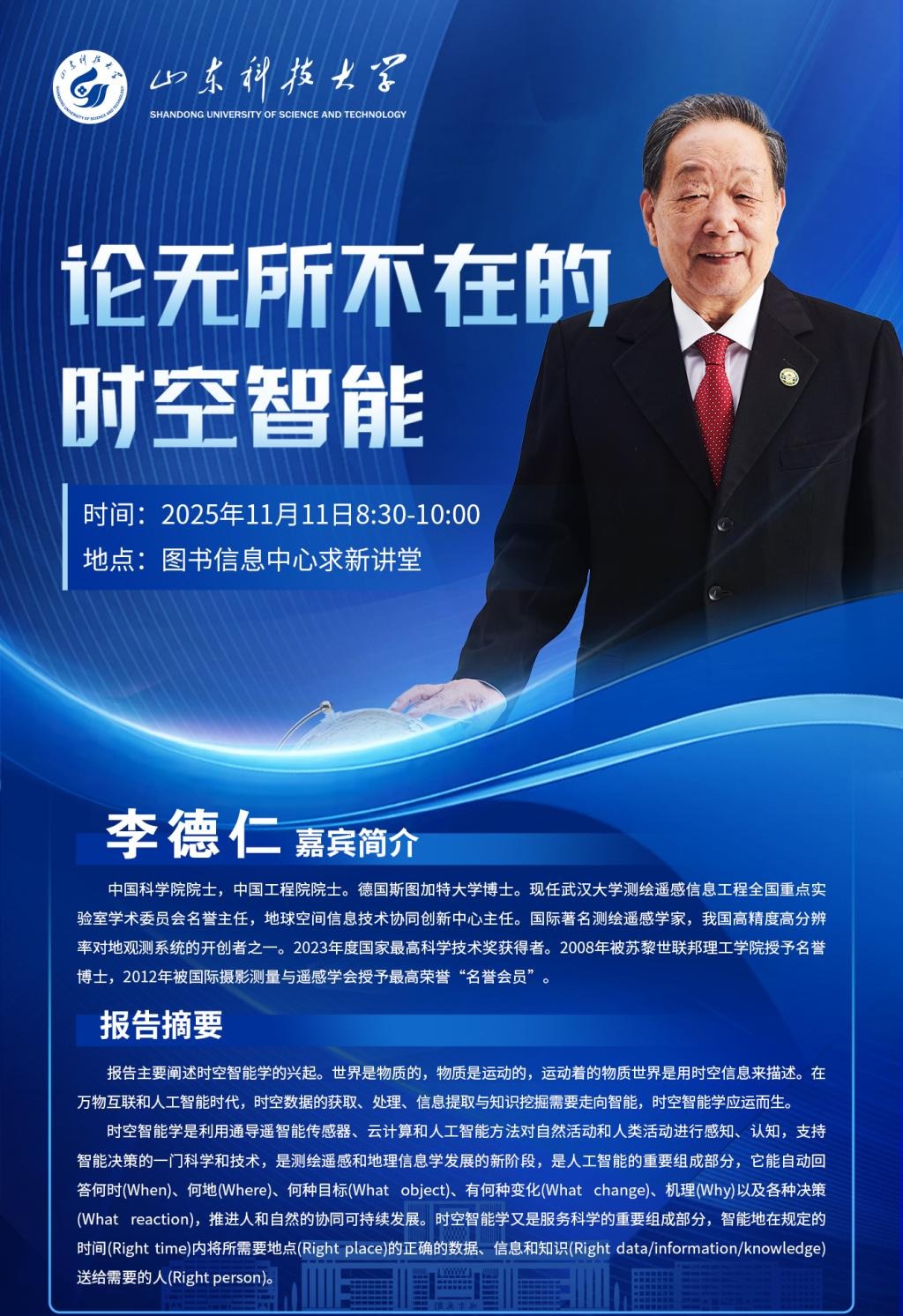 12月18日下午,成人网址 第64期“智绘讲堂”在J6-434报告厅举办。本期讲座特邀山东省测绘地理信息学会理事长曲伟刚作题为“测绘地理信息发展面临的形势与任务”的专题报告吸引了成人网址 230余名师生参加。报告会由成人网址 靳奉祥教授主持。报告中,曲伟刚系统梳理了测绘技术从传统向数字化、智能化转变的发展脉络,深入剖析了新发展格局下测绘地理信息事业所面临的时代机遇与现实挑战。特别介绍了实景三维中国、“一张图”平台、...