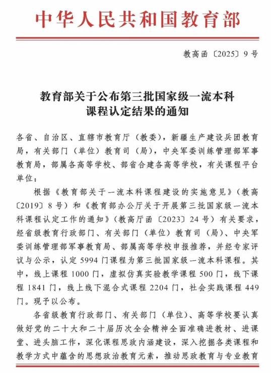 近日,教育部印发《关于公布第三批国家级一流本科课程认定结果的通知》(教高函〔2025〕9号),正式公布第三批国家级一流本科课程名单。成人网址