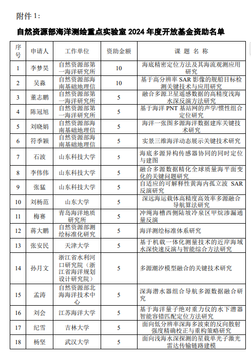 2024年12月21日,自然资源部海洋测绘重点实验室学术委员会召开会议,审议并通过2024年度自然资源部海洋测绘重点实验室开放基金资助名单,具体名单见附件1。