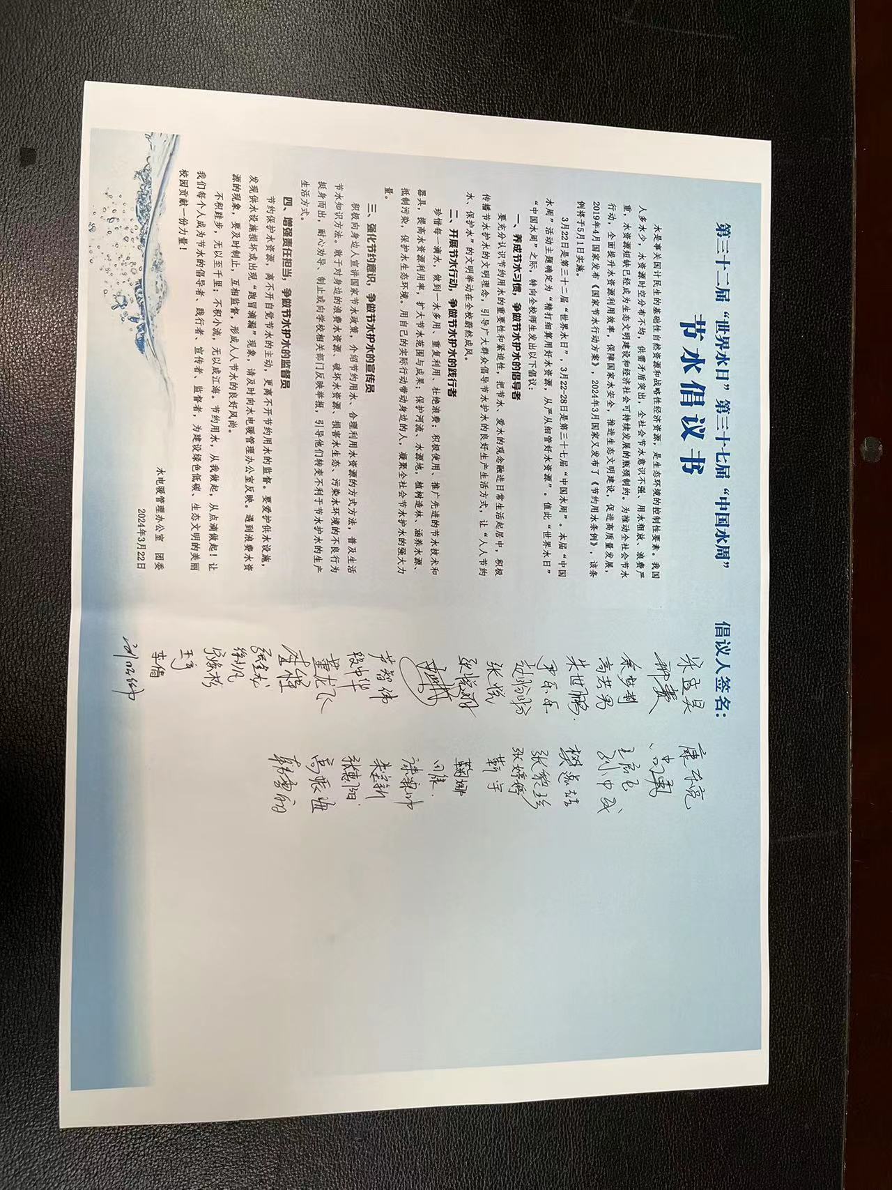 会议伊始,韩雪丽结合“湄公河四国与中国用水争端”这一案例,阐述了当今世界水资源短缺问题日益突出的背景及现状,强调了节约用水的重要性。随后,结合生活中常见的水资源浪费现象,分享了一些生活中节约用水的小窍门。最后,韩雪丽号召党支部全体党员积极响应学校倡议,签署节水倡议书,志愿用实际行动为水资源保护贡献力量。