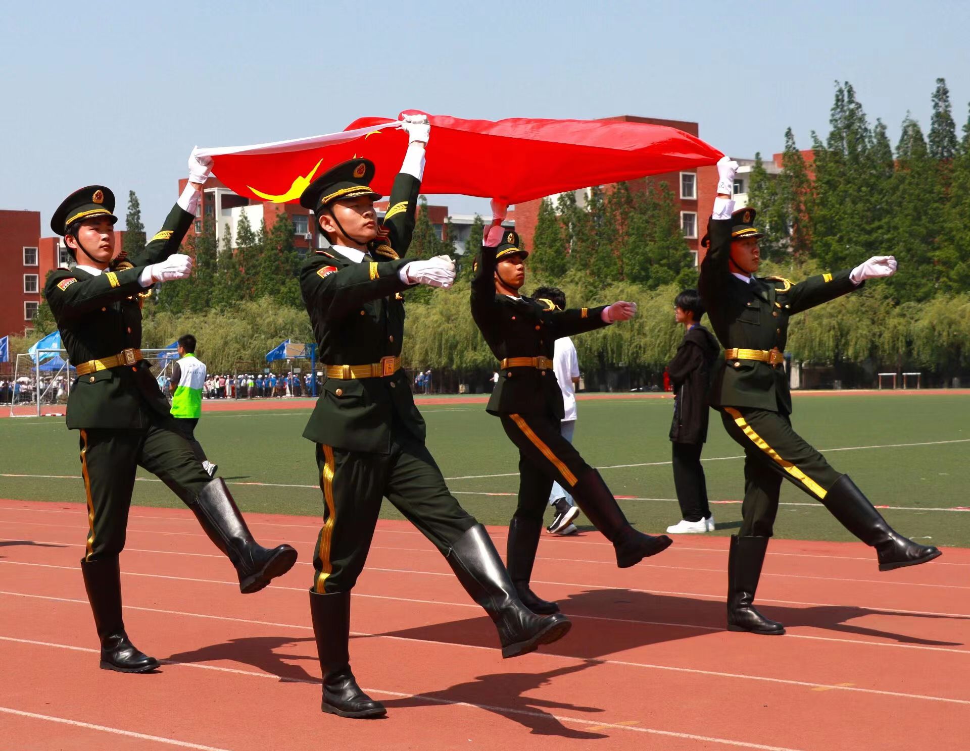 下午14:00,开幕式正式开始。伴着《运动员进行曲》欢快的音乐,8名抬旗手迅速将国旗和校旗展开。执行队长一声令下,旗手迅速挥开队旗,国旗护卫队方队整齐入场。“向右看!”,到达主席台前正步走,精神激扬,气宇轩昂。在环绕操场半周后,到达操场中心就位。“向国旗敬礼!”,抬旗手将国旗高高举起,队员们举枪敬礼,全体师生奏唱国歌。