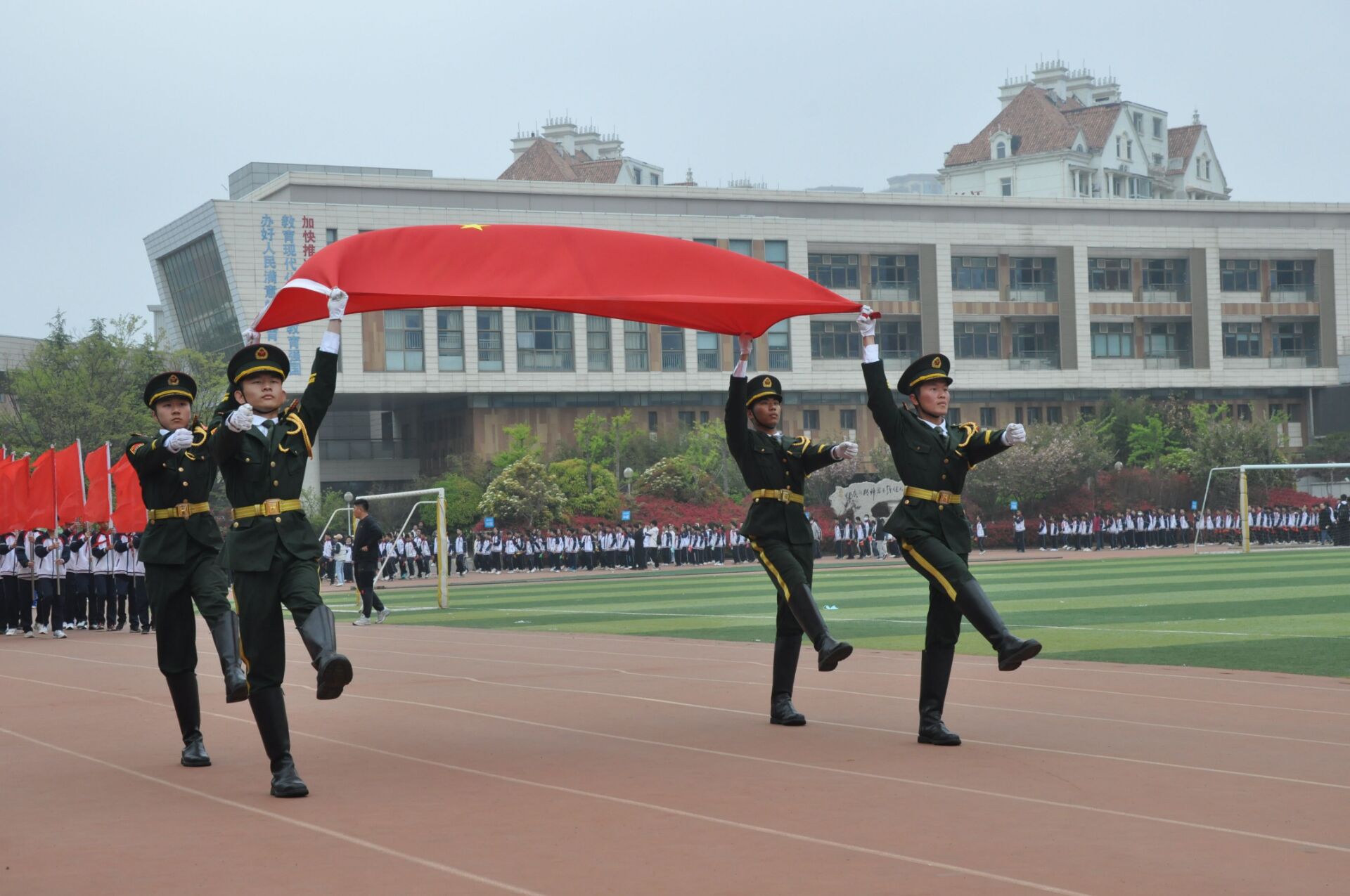 428日,我校国旗护卫队受邀参加育才中学运动会开幕式,负责出旗、升旗、护旗的礼宾任务。
