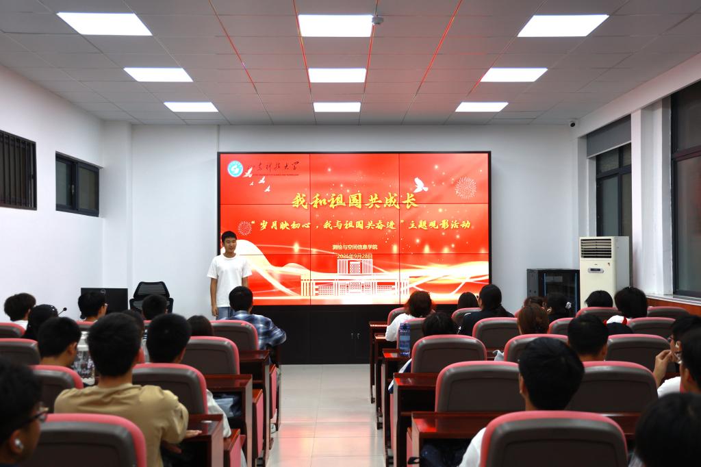活动伊始,学院学生会主席张子超介绍了本次活动的背景,将宏大的“家国情怀”与细腻的“亲情牵挂”紧密联结,为整场活动奠定了温暖的基调。随后,同学们共同观看了影片《我和我的祖国》。从开国大典的升旗仪式到香港回归的历史时刻,再到神舟返回舱的成功着陆,一个个关乎国家与个人命运交织的经典片段,让在场学子深刻体会到“家国相依”的深厚内涵与时代分量。放映结束后,同学们手持鲜艳的小国旗,在镜头前留下了一张张“与祖国同框”的珍贵影像,用青春的笑颜致敬伟大时代。