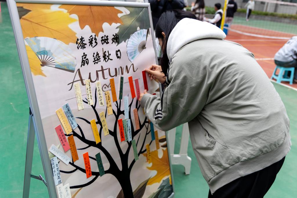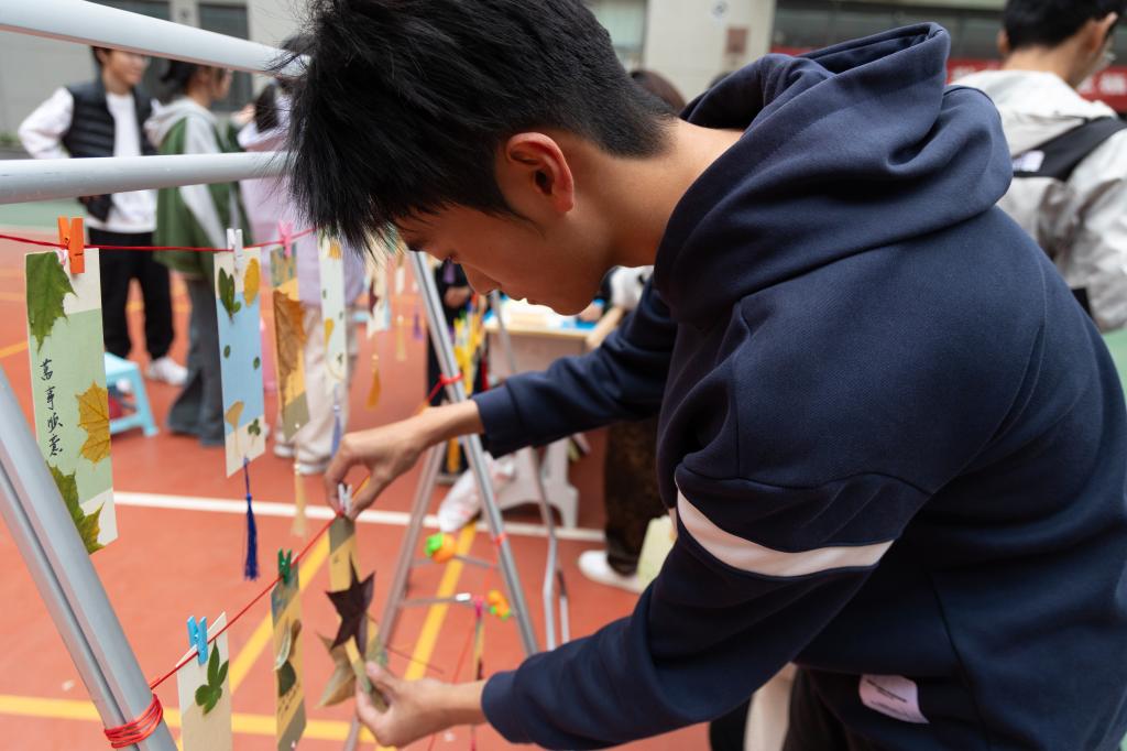 活动形式丰富,包括五个环节。在“秋韵雅集·漆扇绘秋”环节,参与者们以漆扇为载体,用细腻的笔触和丰富的色彩描绘出秋天的韵味。在“秋韵拾趣·树叶书签手作”环节,大家将捡拾的落叶进行精心处理,通过巧妙的构思,将落叶制作成独一无二的精美书签。在“金秋拾叶·落叶绘秋”中,同学们以落叶为纸,以创意为笔,撰写了一篇篇关于秋天的日记;每一片落叶都被赋予了新的生命和意义,成为记忆秋天的独特符号。在“秋韵丰收·柿柿如意庆典”环节,参与者用黏土创作,共同许下了“柿柿如意”的美好愿望,寓意着未来的生活将如秋天的柿子一般,甜美而圆满。在“秋韵野趣·漫漫时光稻草人”环节,参与者们走进了一个由稻草人构成的奇妙世界,共同感受秋天的美好与宁静。