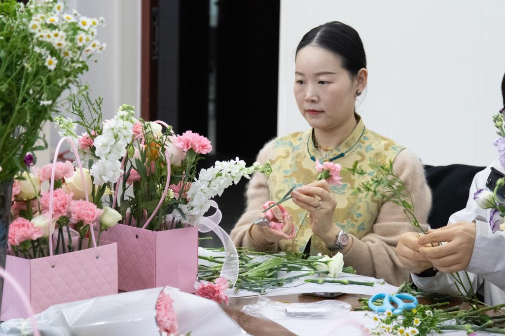 第一会议室里花香扑鼻、热闹非凡,学院全体女教职工正在花艺老师的指导下认真挑选鲜花,准备制作花篮。在这悠悠花香和盈盈笑语中,学院举办的“三八”妇女节创意插花活动就此拉开帷幕,全院女职工齐聚一堂,共赴一场浪漫的繁花之约。