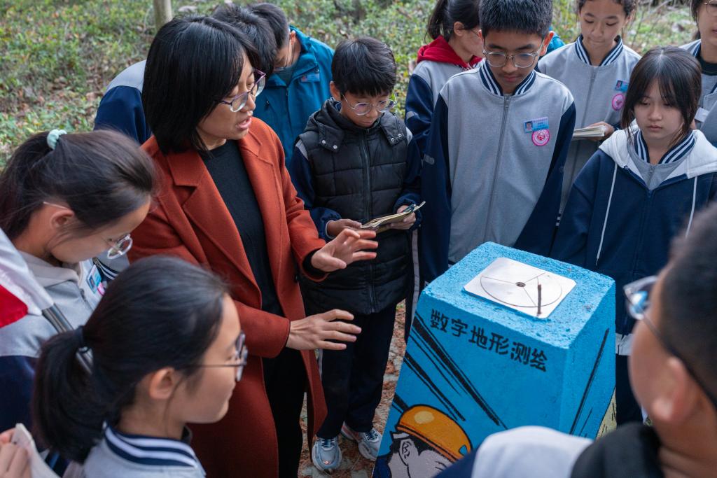 随后,实验中心老师带领同学们参观了标准化测量实验教学场地,对强制对中观测墩、测绘文化彩绘、国家控制点进行了学习了解,并进行了全站仪测距、测角操作体验。在地球科学馆广场,同学们观看了无人机飞行、数据采集及三维建模的全过程,现场气氛十分热烈,赢得了同学们阵阵掌声。