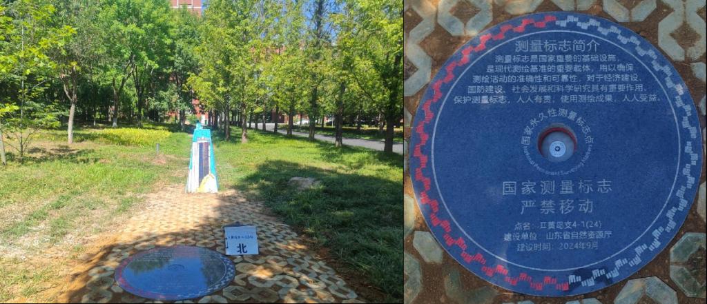 通过与山东省国土测绘院沟通交流,积极配合“四网融合”现代测绘基准体系建设项目推进,9月16日在“嵙测经纬”科普教育基地建成国家永久性测量标志点1个。该测量标志点经过精心设计,外围以“测量标志简介”作为修饰,铭文“测量标志是国家重要的基础设施,是现代测绘基准的重要载体,用以确保测绘活动的准确性和可靠性,对于经济建设、国防建设、社会发展和科学研究具有重要作用。保护测量标志,人人有责;使用测绘成果,人人受益”。测量标志位于地球科学馆西侧空地,与科普基地建造的12个强制对中观测墩浑然一体,为测绘科普教育增添了重要资源。