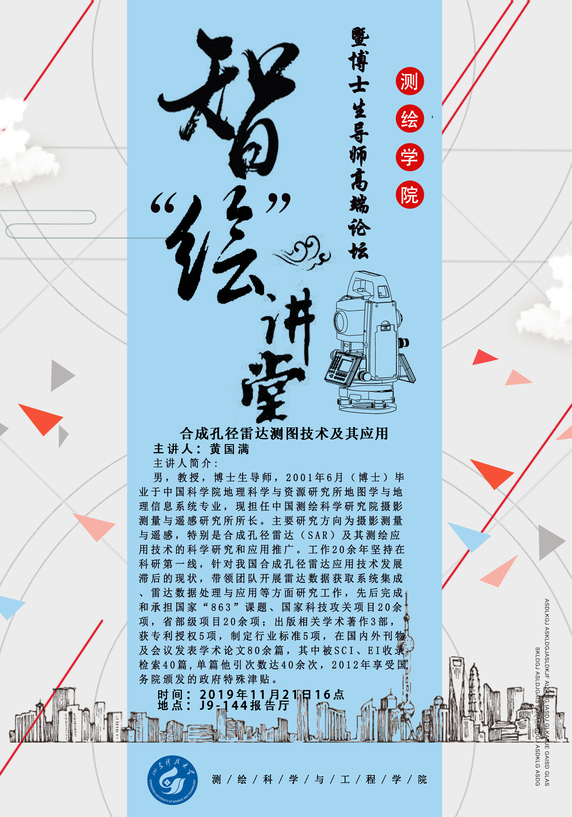 2019年11月21日下午4时,测绘科学与工程学院智“绘”讲堂暨博士生导师高端论坛第三期在J9-144学术报告厅成功举办。本期论坛邀请了中国测绘科学研究院摄影测量与遥感研究所所长黄国满教授作“合成孔径雷达测图技术及其...