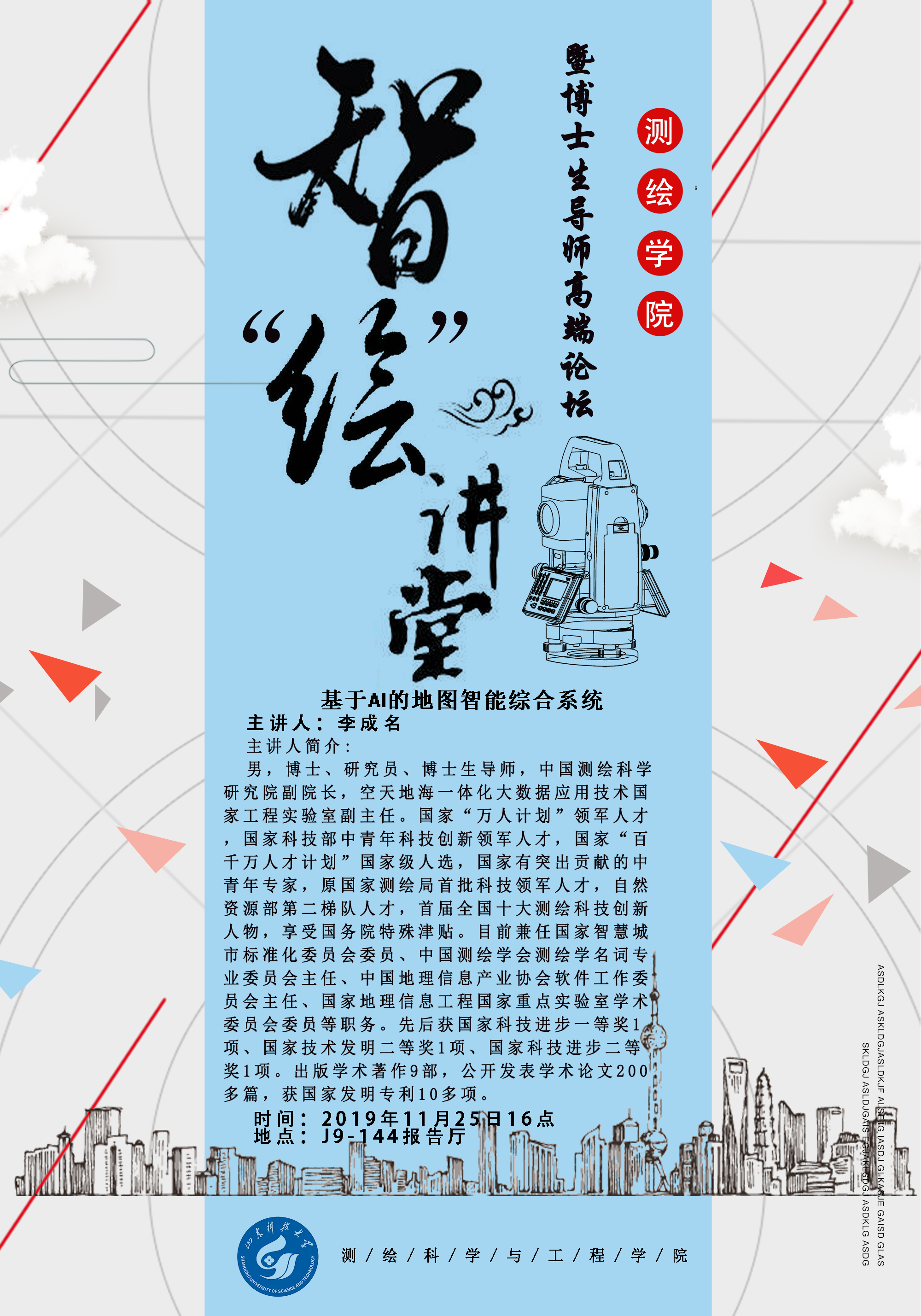 2019年11月25日下午4时,测绘科学与工程学院智“绘”讲堂暨博士生导师高端论坛第六期在J9楼144学术报告厅成功举办。本期论坛邀请了中国测绘科学研究院李成名研究员作“基于AI的地图智能综合系统”专题报告。报告由测...