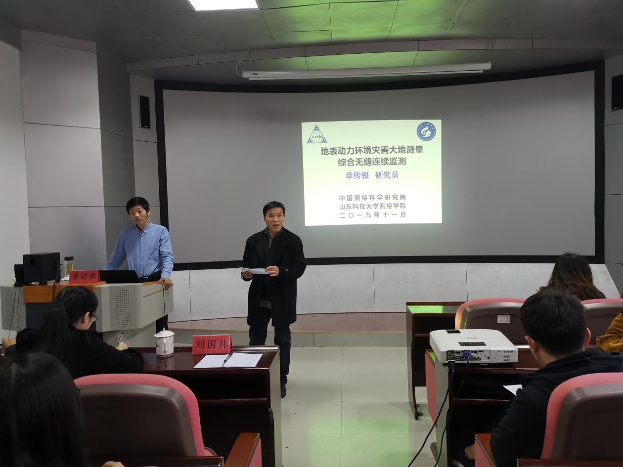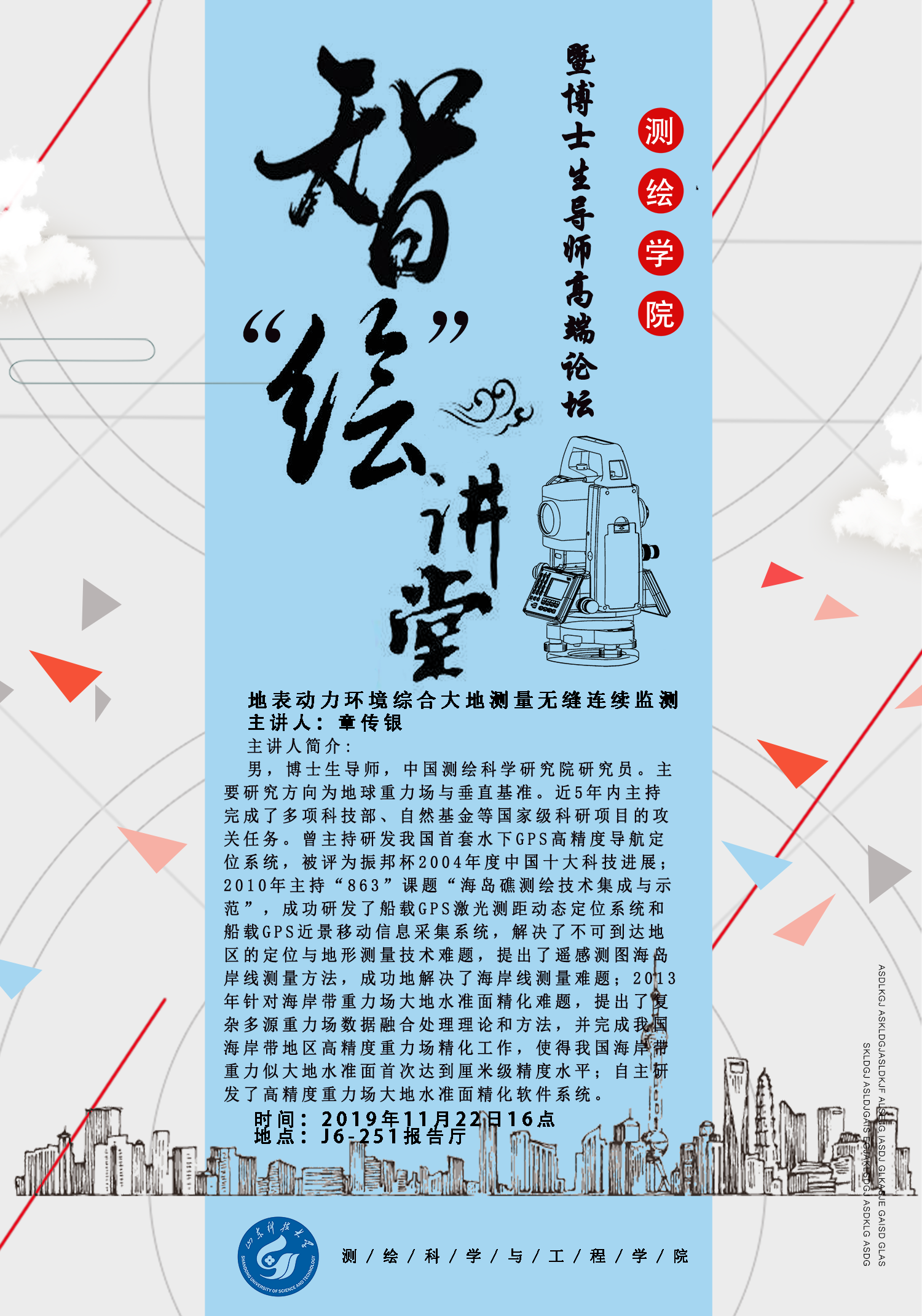 2019年11月22日下午4时,测绘科学与工程学院智“绘”讲堂暨博士生导师高端论坛第四期在J6楼251学术报告厅成功举办。本期论坛邀请了中国测绘科学研究院章传银研究员作“地表动力环境综合大地测量无缝连续监测”专题报...