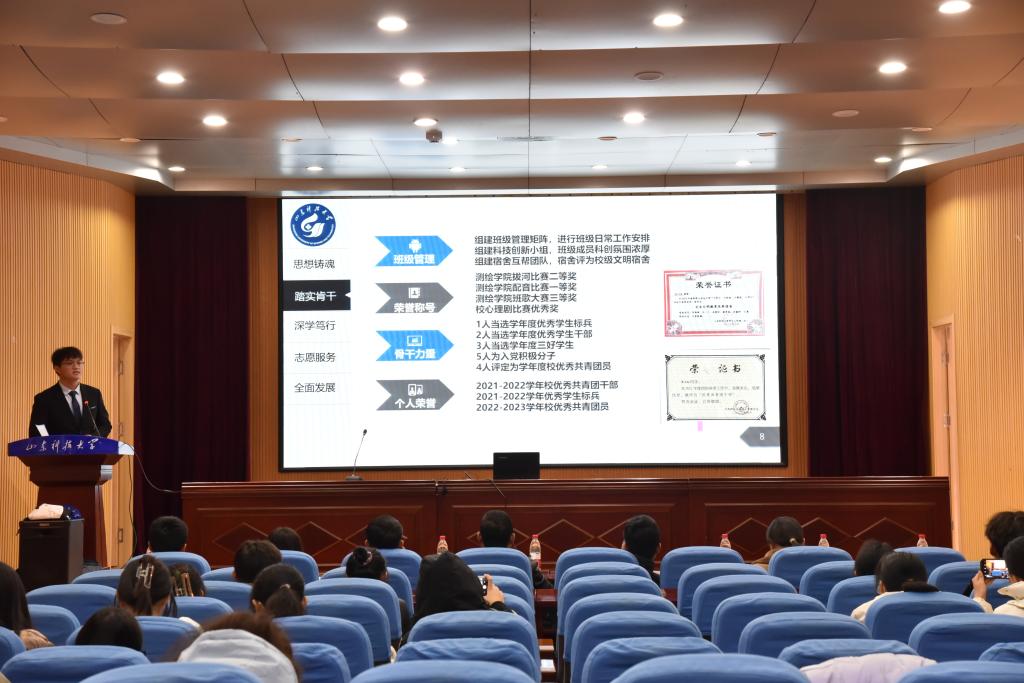 3月5日下午,成人网址 于J6-434报告厅举行2023年度省级荣誉称号推选答辩会。经过个人申请、资格审查,有7位同学作为省优秀学生候选人、4位同学作为省优秀学生干部候选人进入答辩环节。会议伊始,主持人介绍了答辩流程及注意事项。随后,各位同学依次上台进行汇报、展示。他们有的思政品质高尚,乐于公益事业;有的学业成绩优异,用奋斗描绘青春;有的勇于攀登,创新成果颇丰;有的热衷实践,用坚定脚步传递力量,充分展现了测绘...