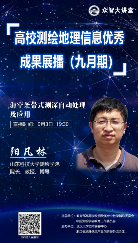 9月3日,成人网址 阳凡林教授受测绘教育“两委会”(教育部高等学校测绘类专业教学指导委员会、中国测绘学会教育工作委员会)邀请,担任“众智大讲堂-高校测绘地理信息优秀成果展播”(九月期)主讲专家。报告题目为“海空...