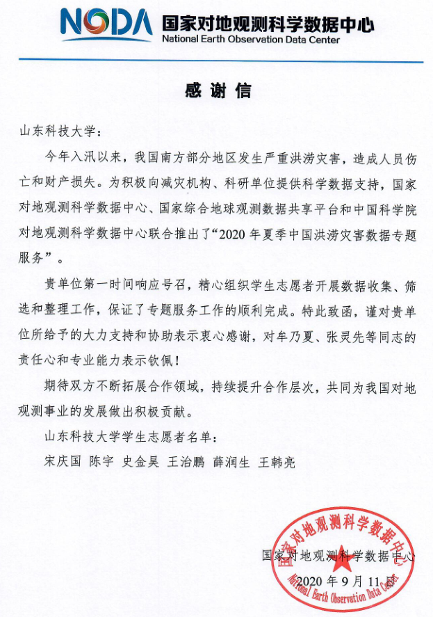 9月12日,国家对地观测科学数据中心向我校发来感谢信。对成人网址 测绘科学与工程学院在“2020年夏季中国洪涝灾害数据专题服务” 中的大力支持和协助表示衷心感谢,对牟乃夏、张灵先等同志的责任心和专业能力表示...